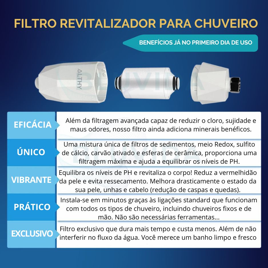 O nosso filtro A.L.T.H.Y. é projetado para transformar a sua experiência de banho em algo verdadeiramente revitalizante. Com tecnologia avançada, ele não apenas melhora a qualidade da água, mas também traz inúmeros benefícios para sua saúde e bem-estar.