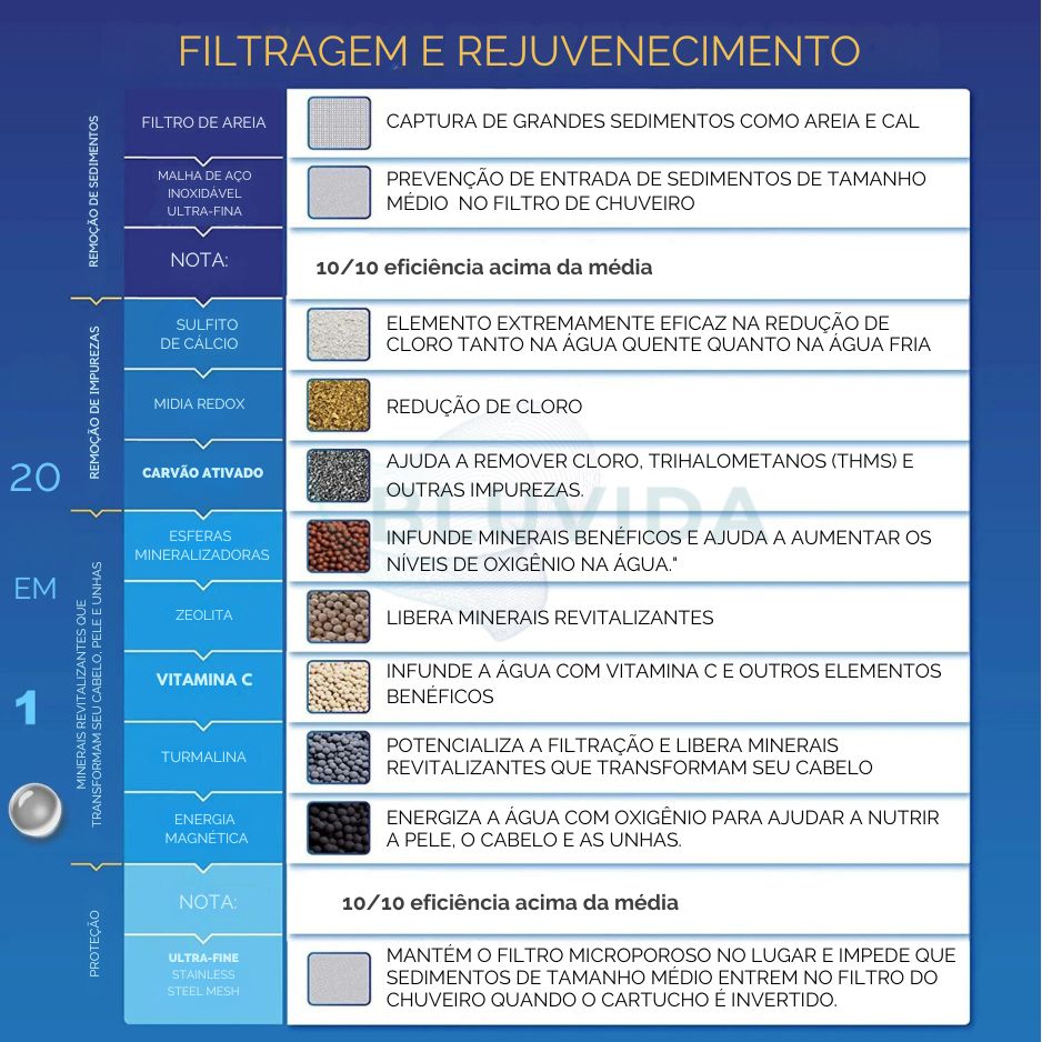 Enquanto a maioria dos filtros de chuveiro apenas remove alguns produtos químicos por um curto período, O nosso FILTRO reduz o cloro, pesticidas, produtos farmacêuticos, sujeira e odores, ajudando a controlar a descamação na pele e restaurando os danos causados pela água dura e químicos em seu cabelo.